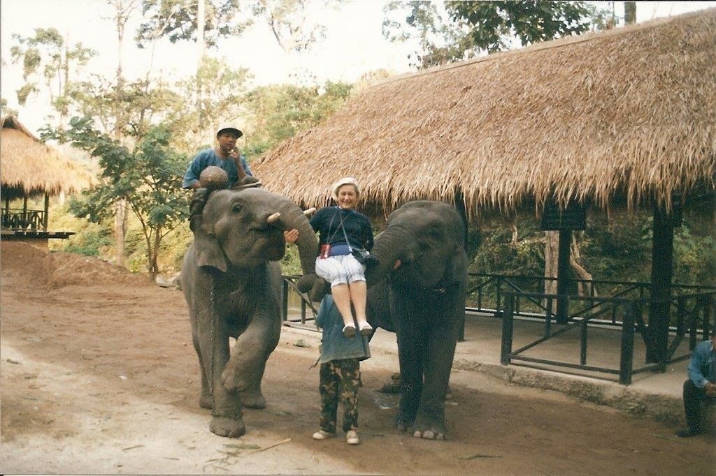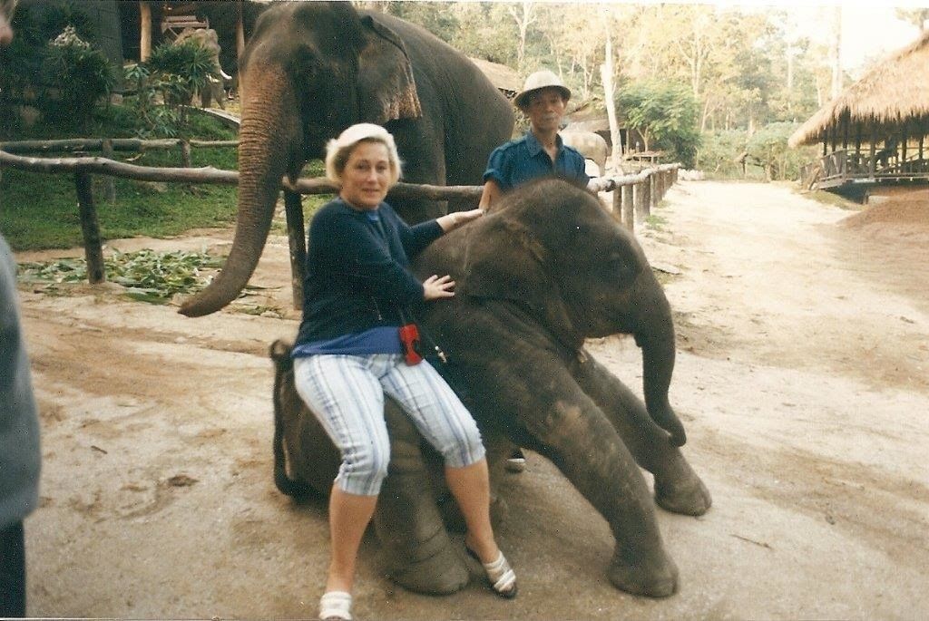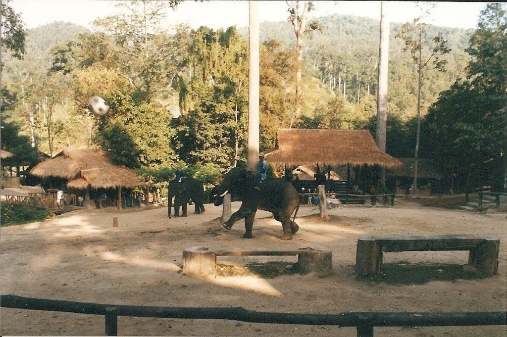 La première avec 2 éléphants trompe nouée où je fais de la balançoire, la deuxième un bébé éléphant, la troisième c'est un éléphant qui joue au ballon. On voit le ballon dans les airs car ils ne ratent jamais leur cible. Ils sont très doués et avec n'importe quelle patte. Ces photos datent de 1999 et je ne me rappelais plus que j'étais colorée si blonde. Quelle horreur !